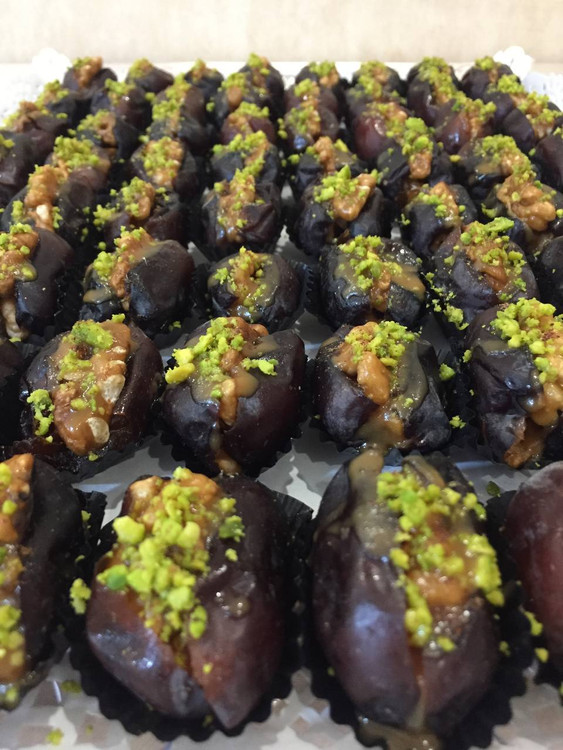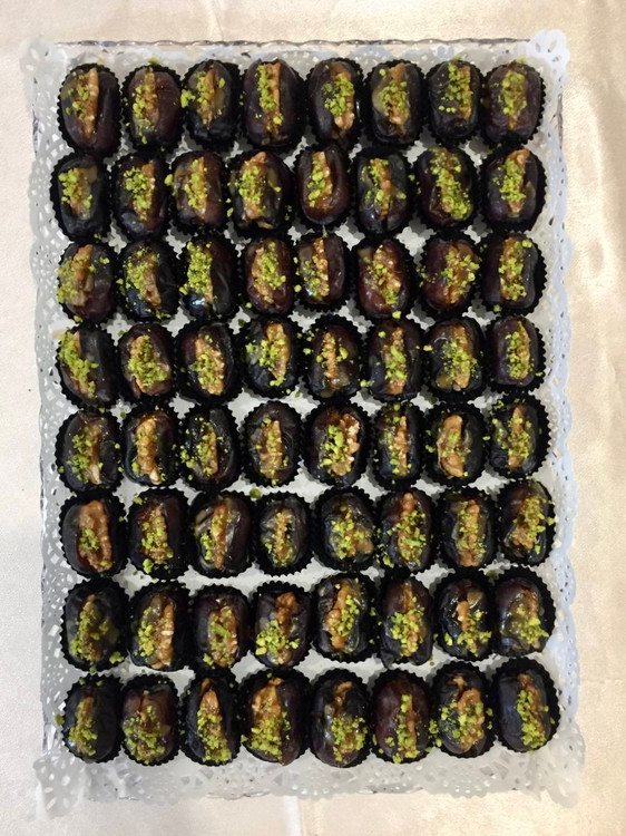 سینی: هر سینی دسر خرما حلوا گردویی دارای ۶۴ عدد خرما با گردو و پودر پسته هست